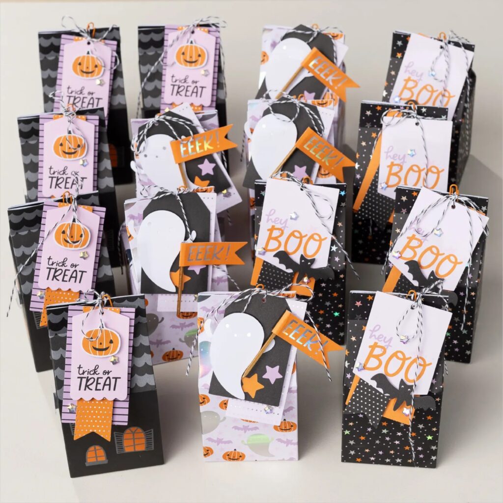 Make Halloween gifting extra special with the Sweet & Spooky Kit! Designs feature cute ghosts, bats, pumpkins, and more in a fun palette of black, pink, orange, and iridescent. With matching tags and ribbon included, these sweet boxes are perfect for party favors, classroom treats, or spooky surprises.