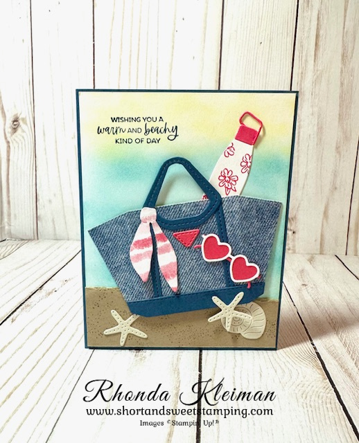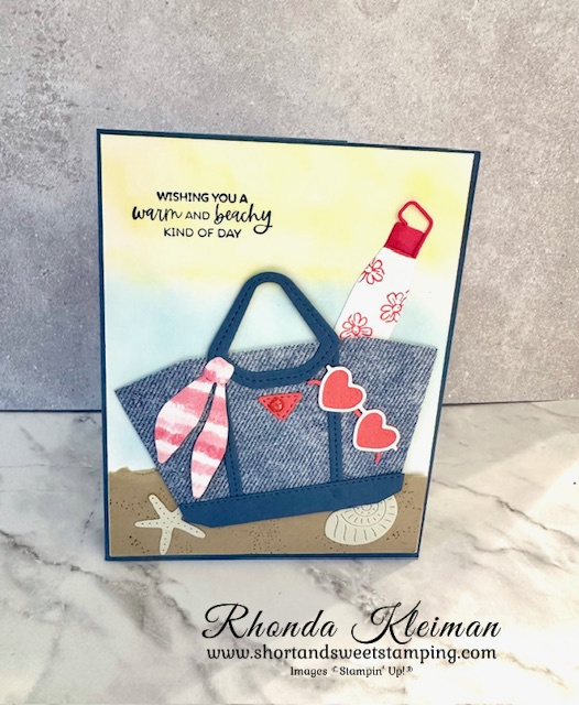 - Stamp greeting with Misty Moonlight ink in left top corner of card. I used one of my most favorite beach-themed greetings from Paradise Palms, a retired stamp set that I will never get rid of!