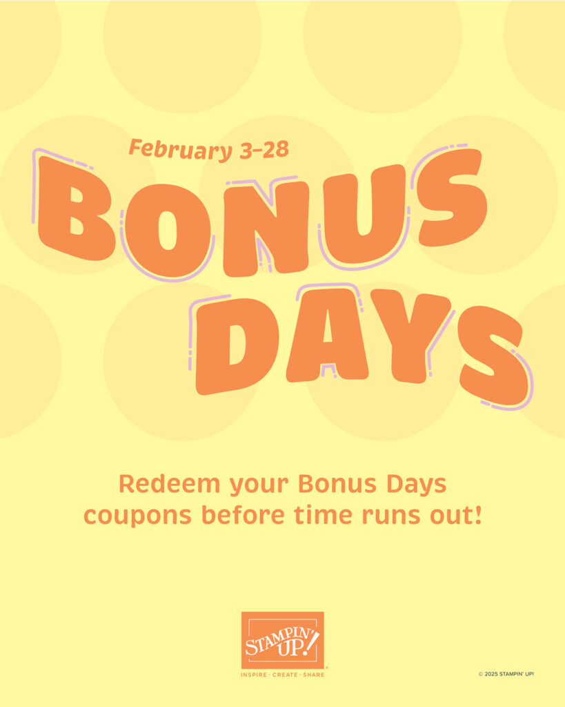 It’s time for one of our favorite promotions—BONUS DAYS! When you shop between January 6 and February 2 and spend $50 USD | $60 CAD, you will earn a $5 USD | $6 CAD coupon! You can redeem them between February 3 and 28. And don’t forget—each purchase earns you Stampin’ Rewards, so that’s even more bang for your buck!