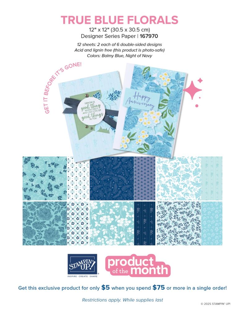 This month’s product is True Blue Florals 12” x 12” Designer Series Paper. Main colors are Balmy Blue and Night of Navy. Item number is 167970.